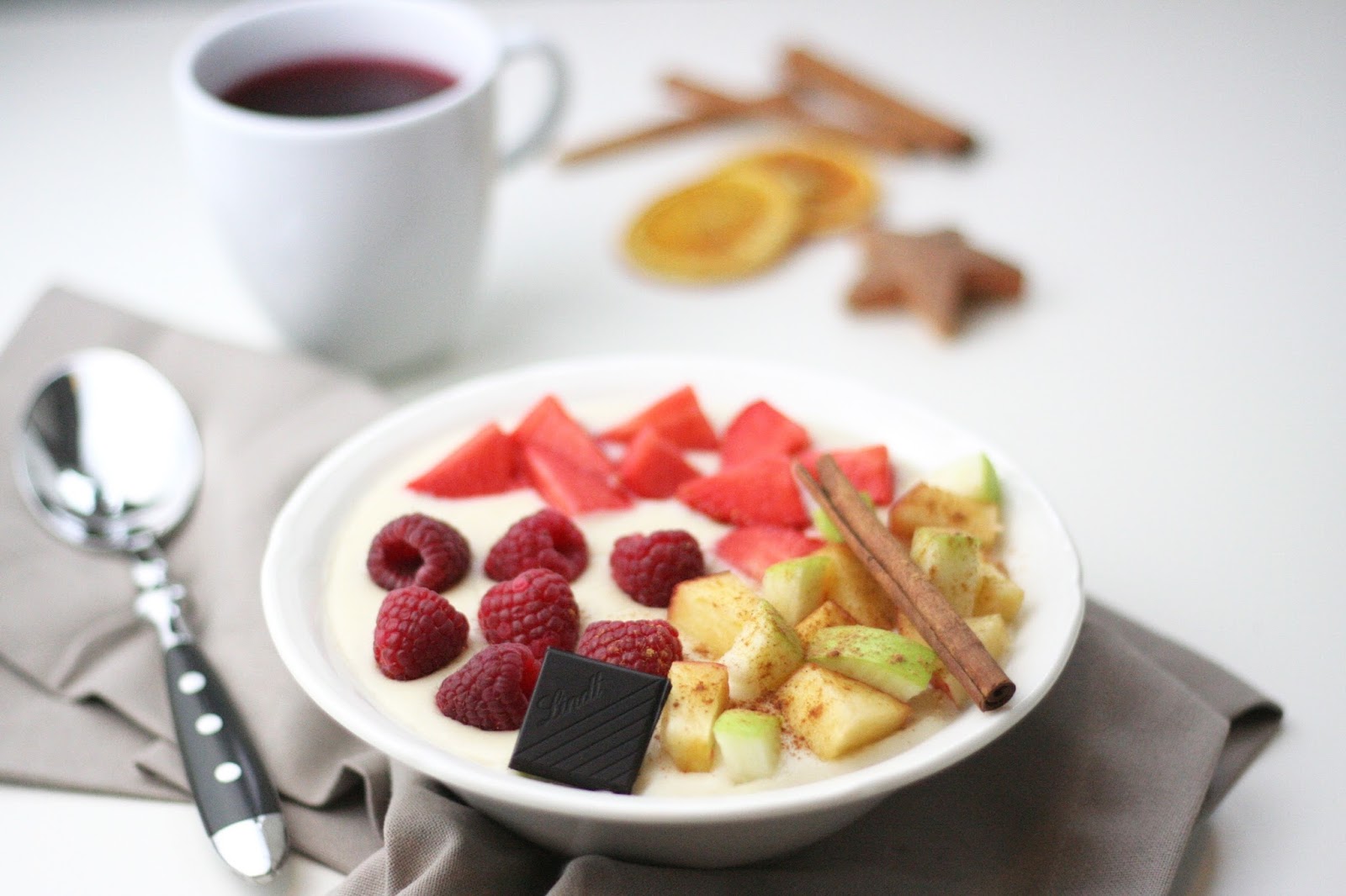 – Gewürze (zB. Zimt), Chia Samen, Goji Beeren, Nüsse, Flohsamenschalen (sehr ballaststoffreich) etc.